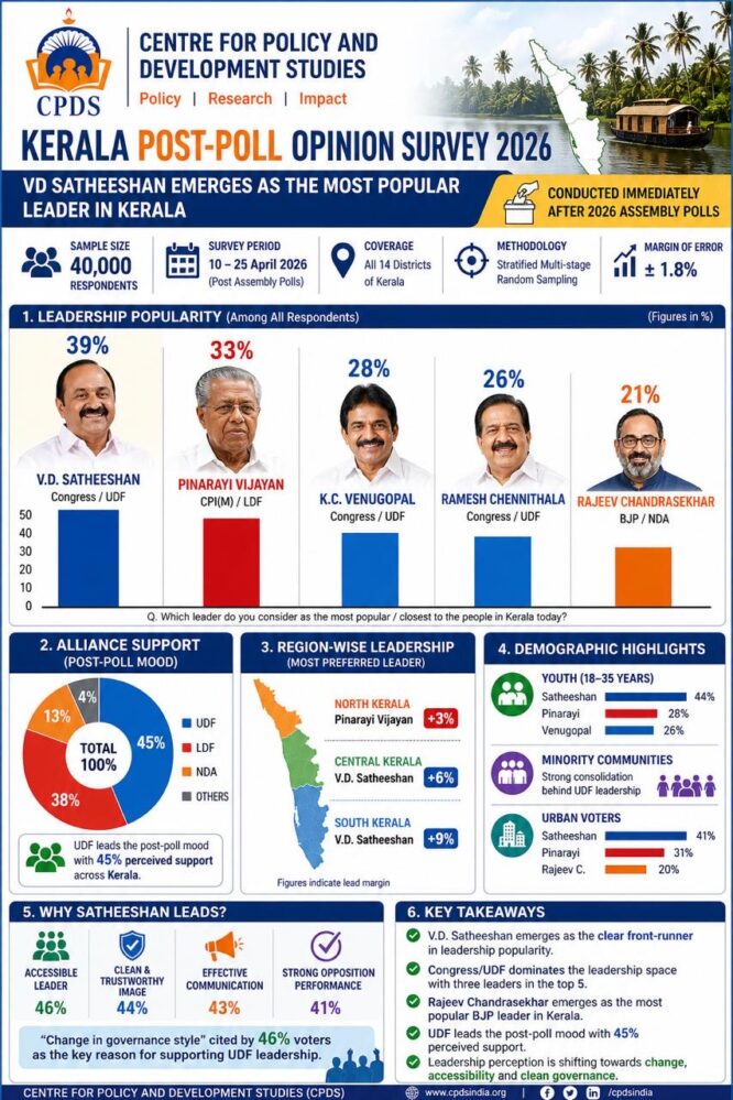 A comprehensive post-poll opinion survey conducted by the Centre for Policy and Development Studies (CPDS) has placed Leader of Opposition V.D. Satheeshan as the most popular political leader in Kerala, signalling a notable shift in public sentiment following the 2026 Assembly elections.